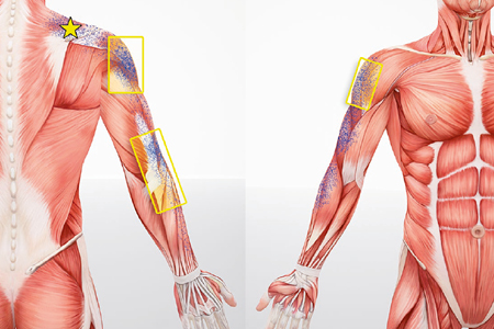 Extracorporeal shock waves (ESW) may induce typical referred pain as illustra- ted below for the supraspinatus and infraspinatus muscles (examples).